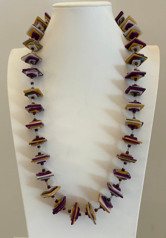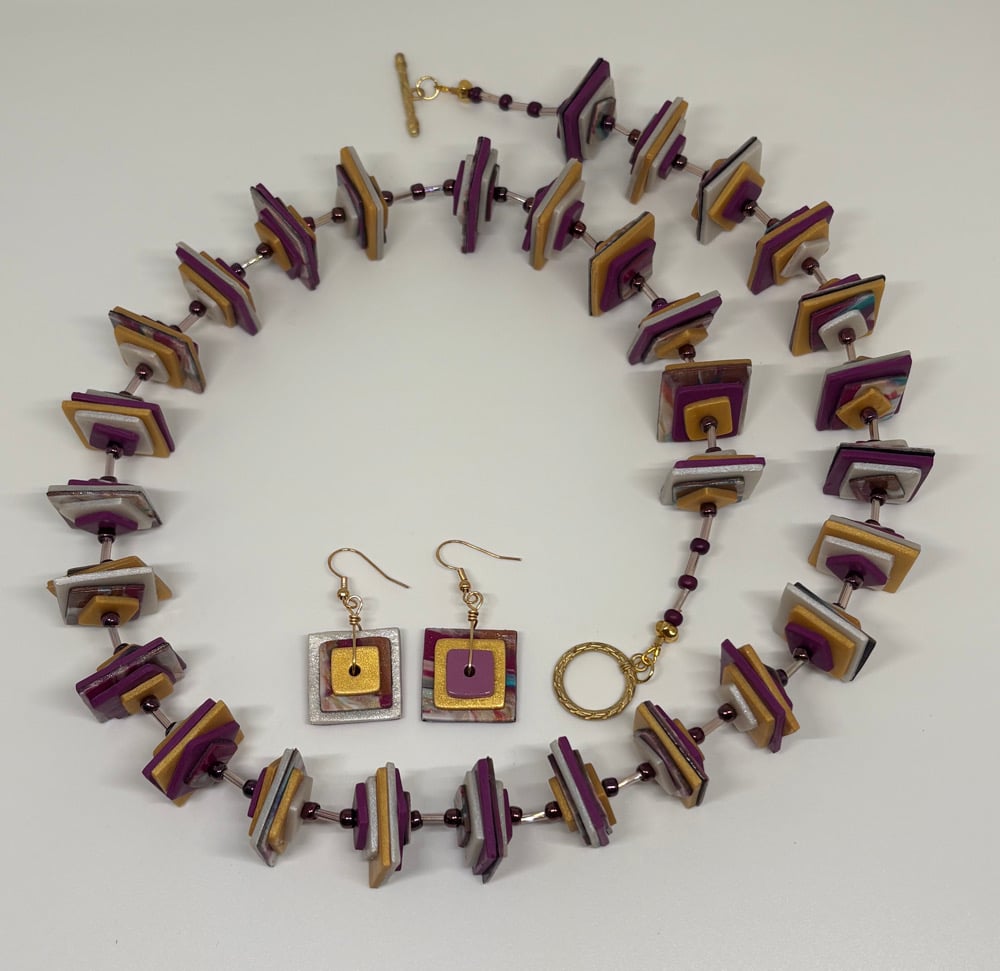 This long 27” stacking squares necklace has movement! Beautiful colors of wine, gold & purple. Earrings are included.