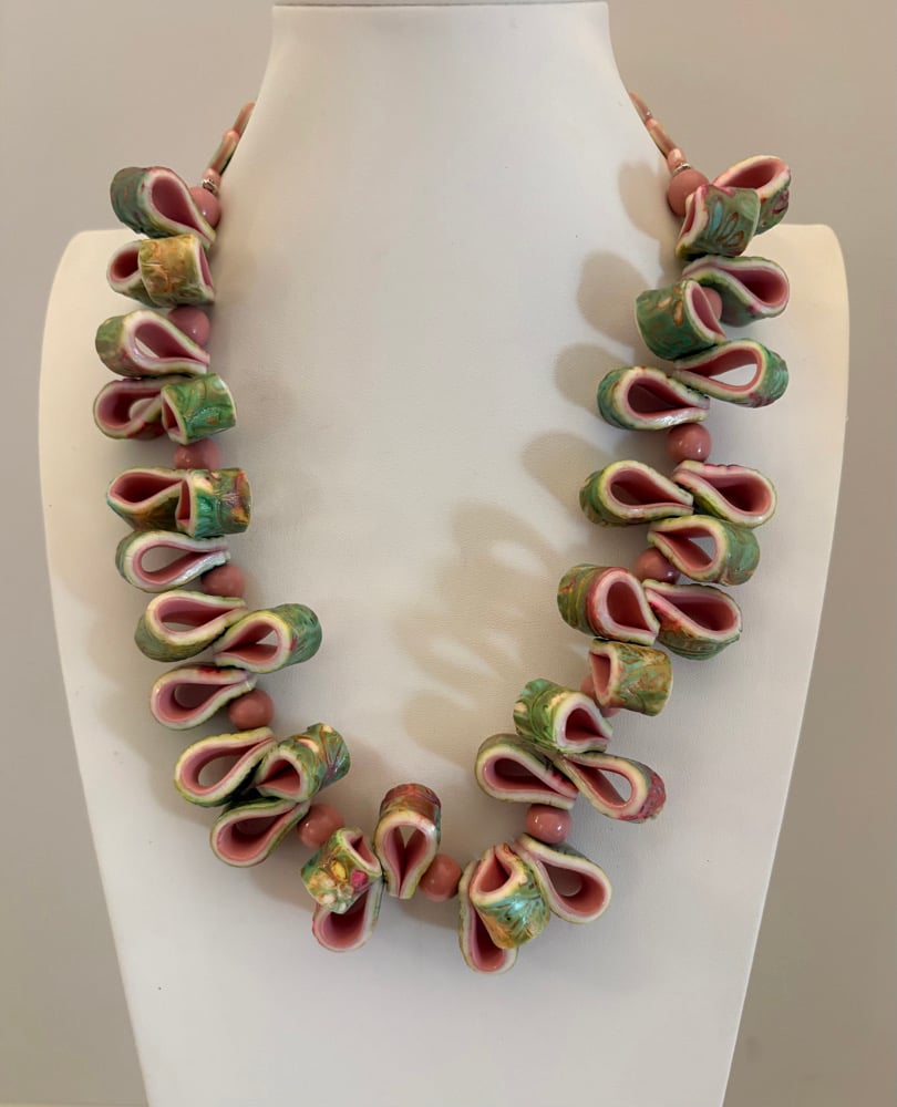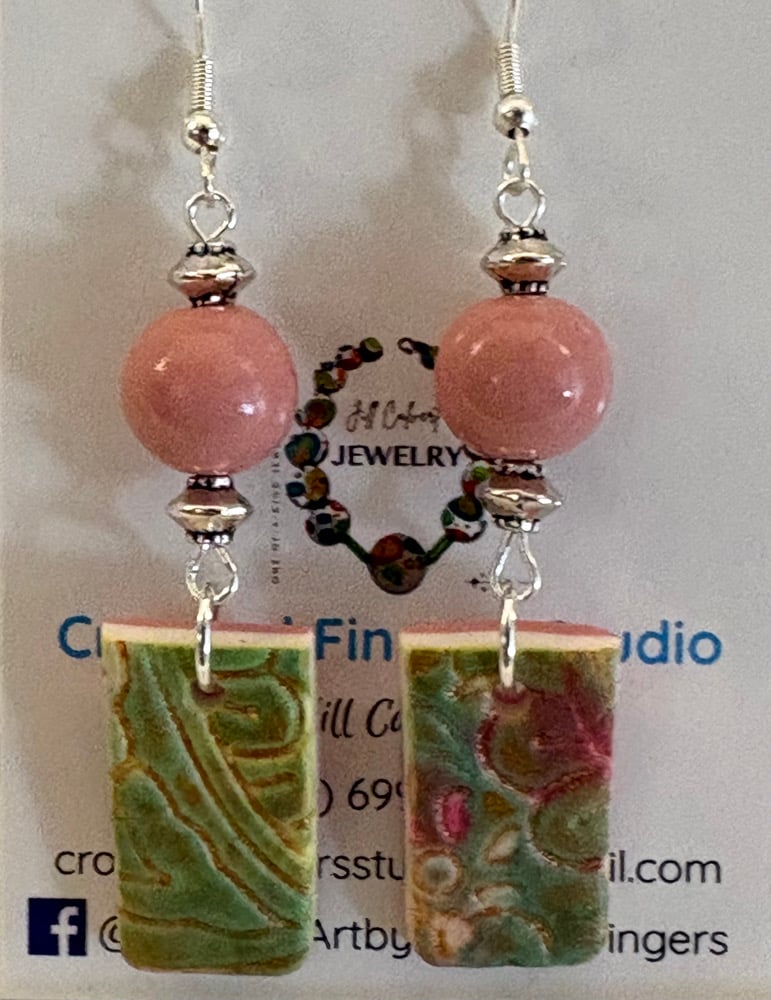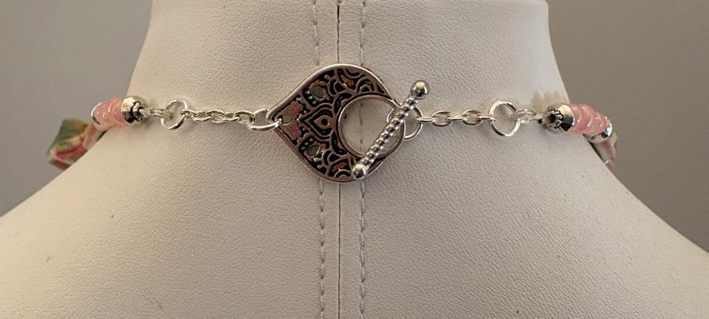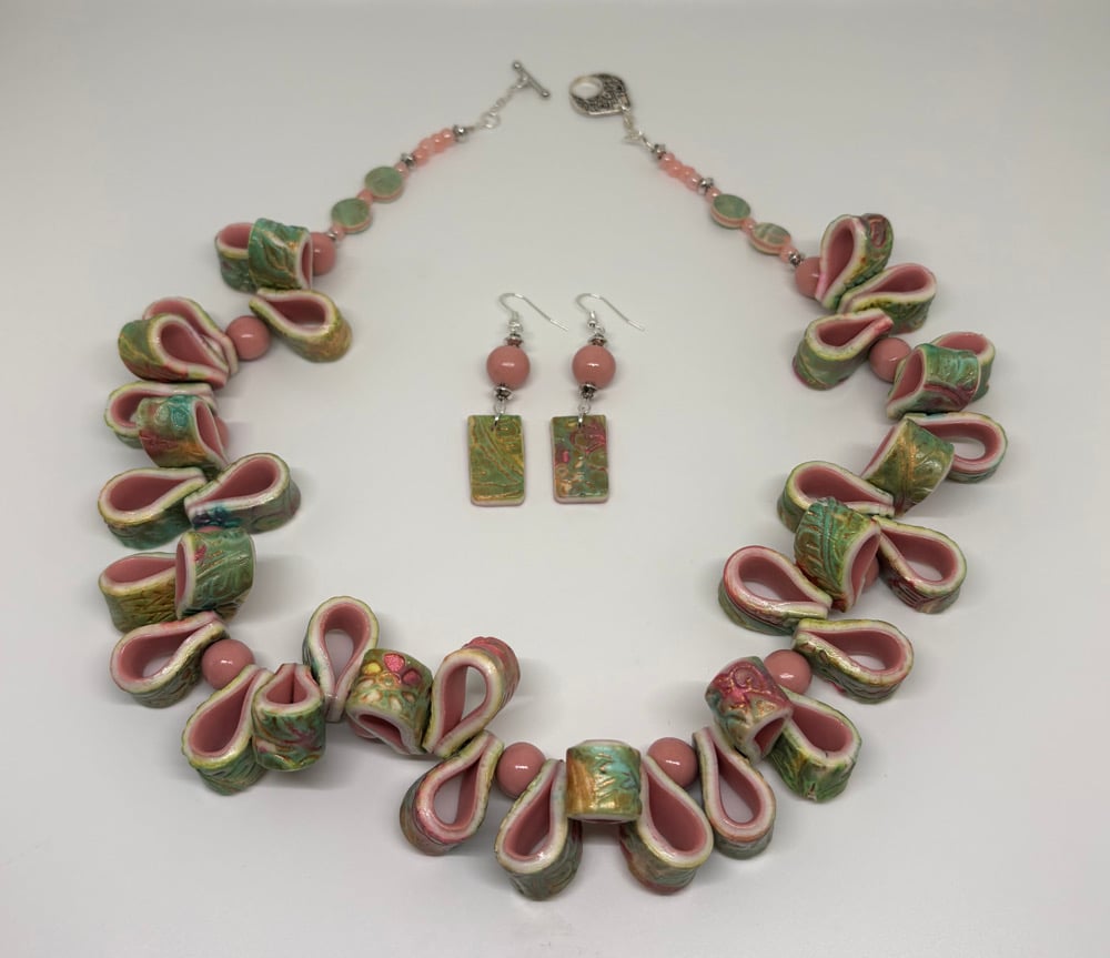 This dusty pink 22” necklace with a sweet little toggle clasp has all kinds of swing! Earrings are included.