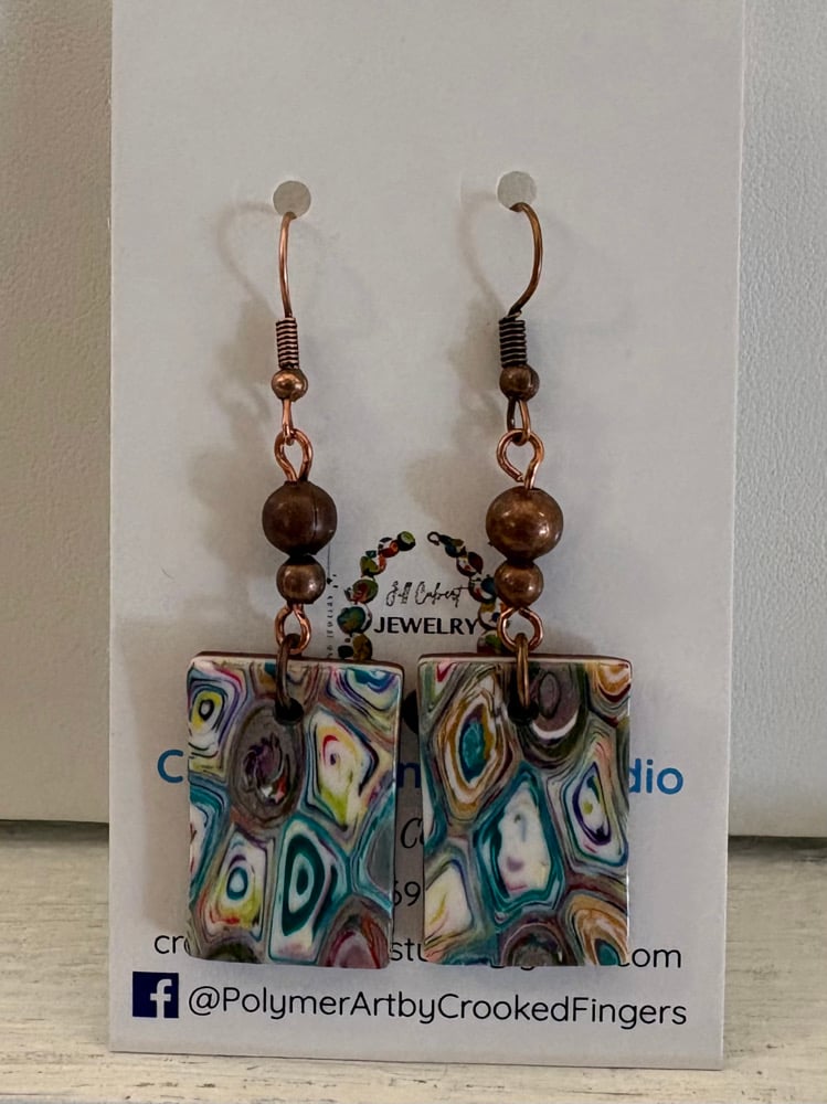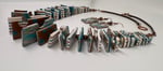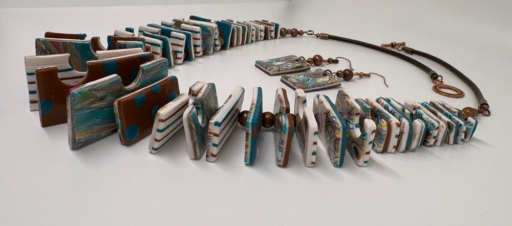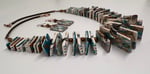 Teal, brown and white are the featured colors of this unique and lightweight necklace with a toggle clasp. Checkout all of the images to see how it looks different from each angle! Earrings are included.