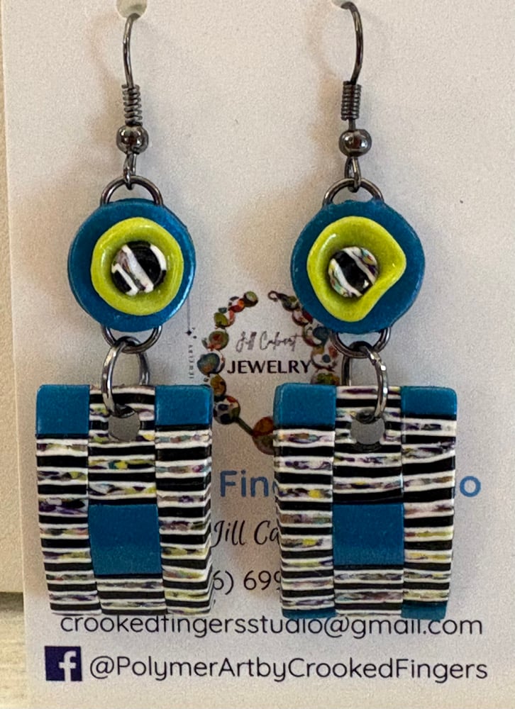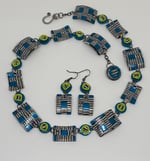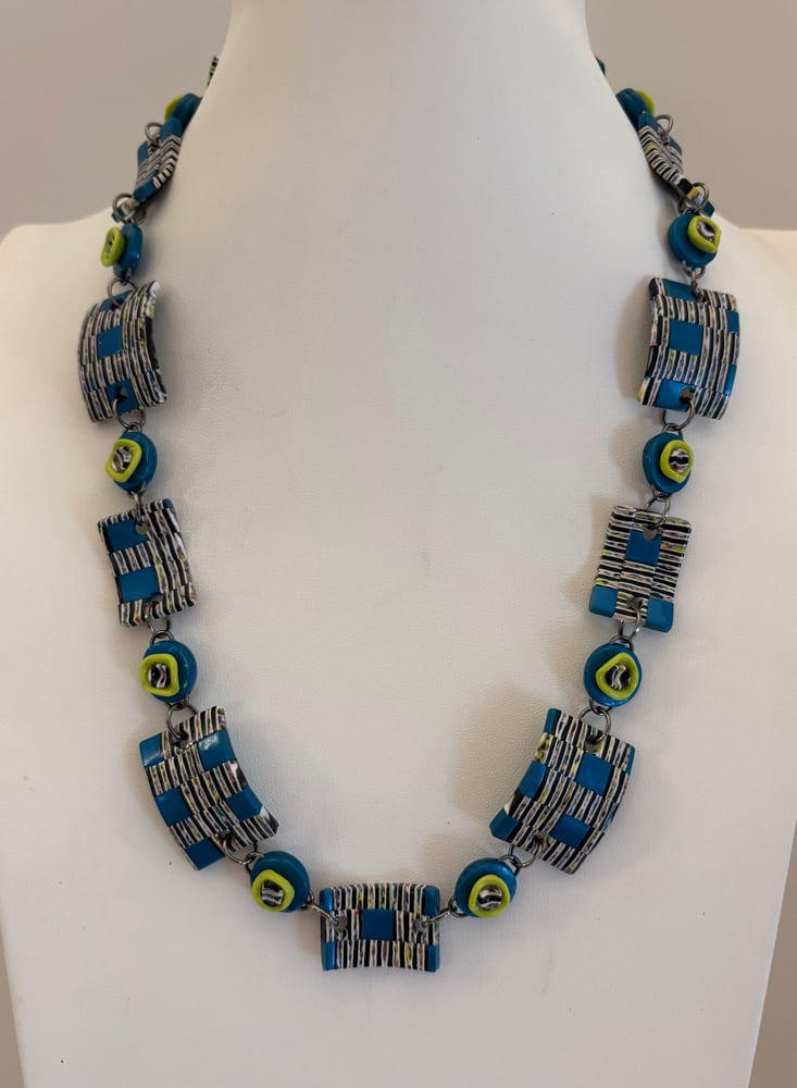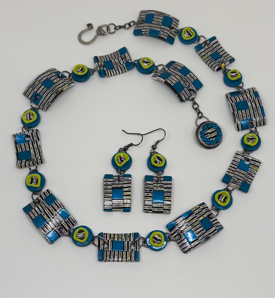 This teal and lime green necklace is 22” in length and has a matching button & hook clasp. Earrings are included.