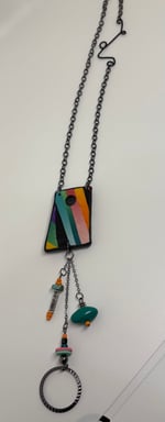 This 26” pendant with a large lobster clasp has color, some dangle, and a little wacky wire in the chain. She’s basically a hot mess, so don’t tell her mom! Sorry, she doesn’t have earrings to match.