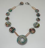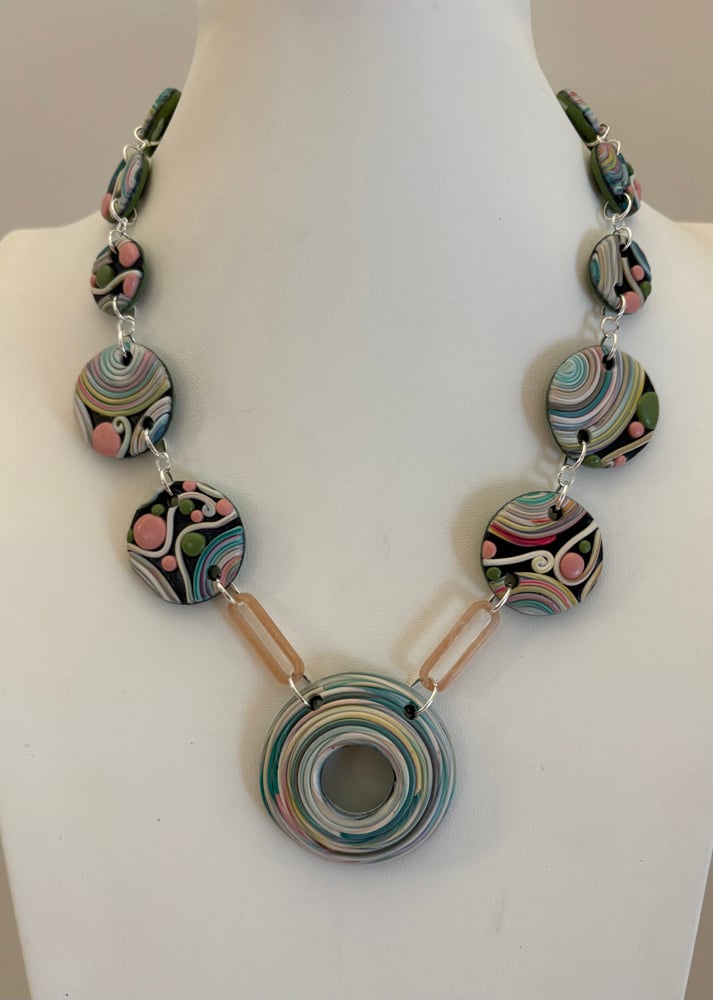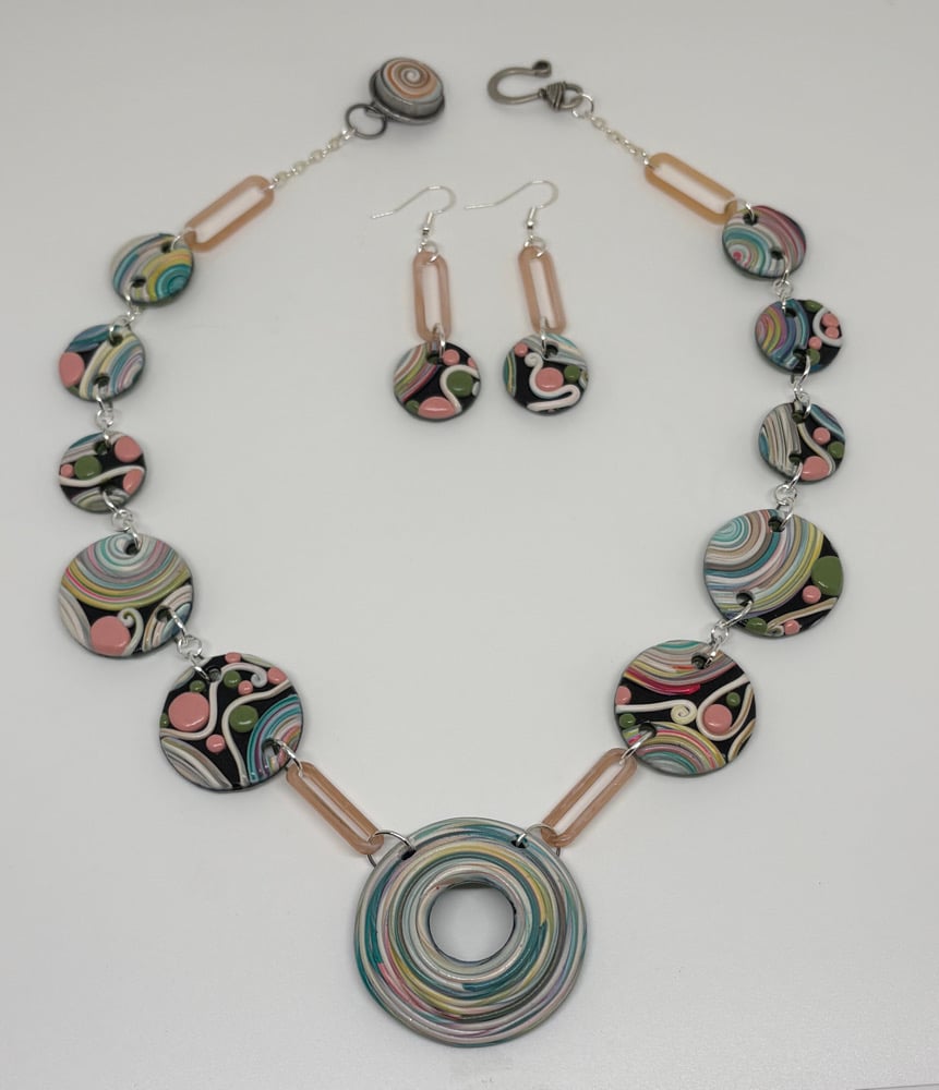 This 20” necklace with a swirly design has a matching button hook clasp. Earrings are included.