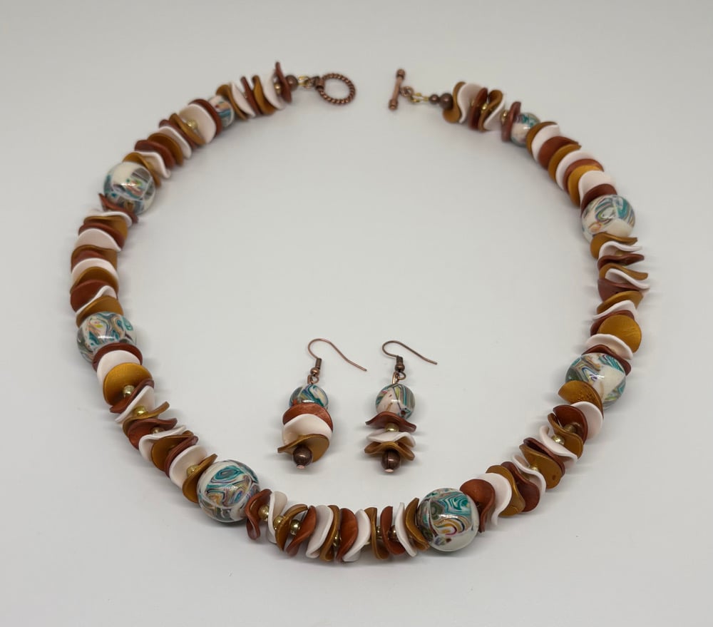 This 20” necklace with copper, white & gold has lots of wavy pieces. Earrings are included.