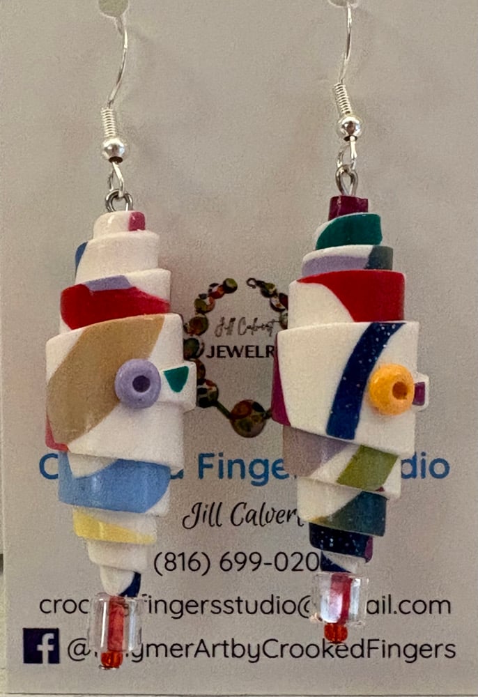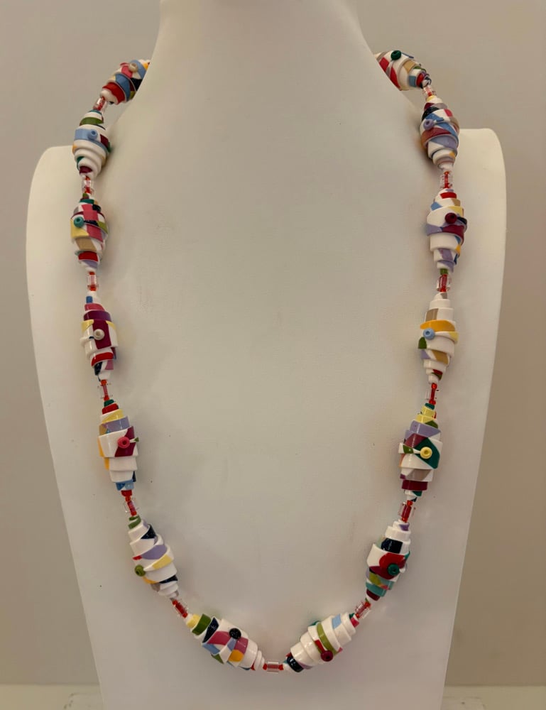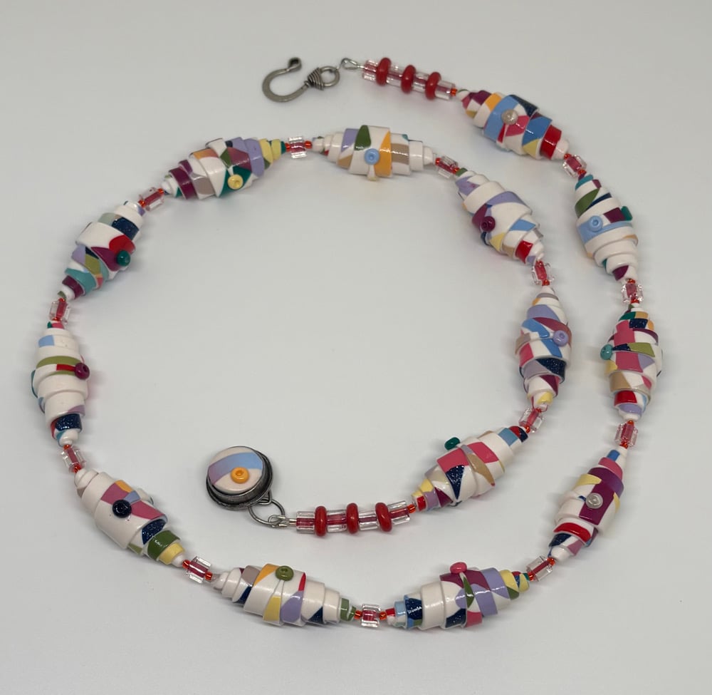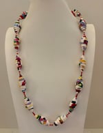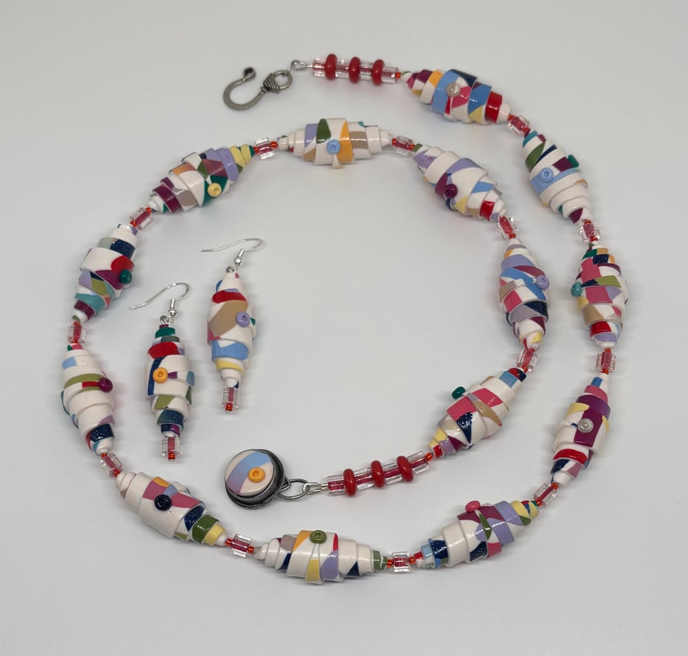 This long 27” necklace has all the colors wrapped into one! It has a matching button and hook clasp, and earrings are included.
